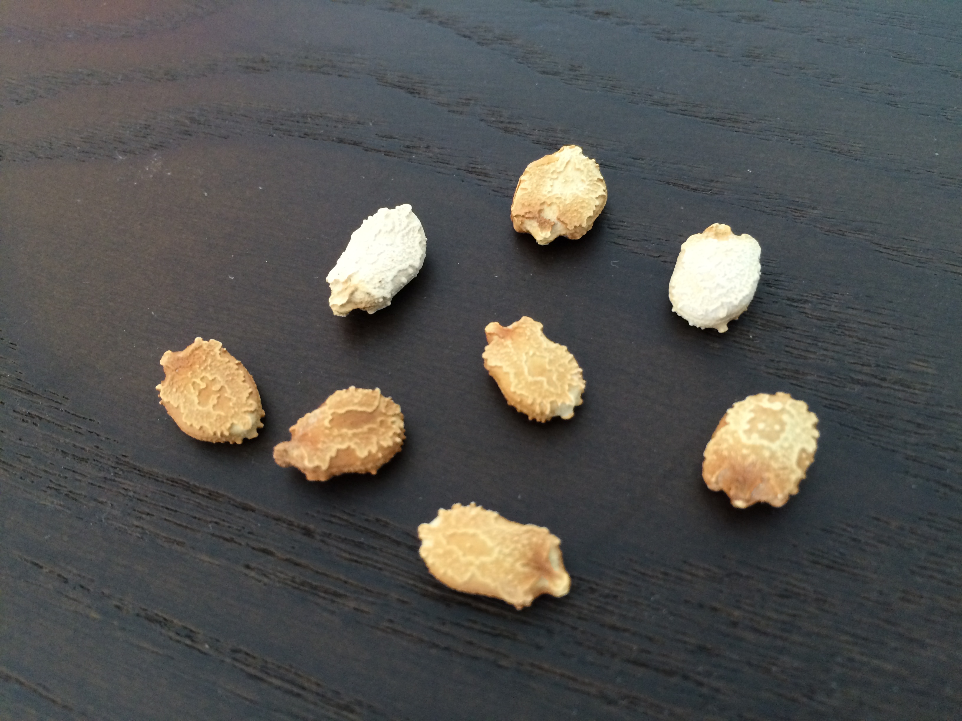 左が切る前。この出っ張りを切って、右のようにします。こんな感じに、少し中の緑色の芽らしきものが見えるくらいでOKです。