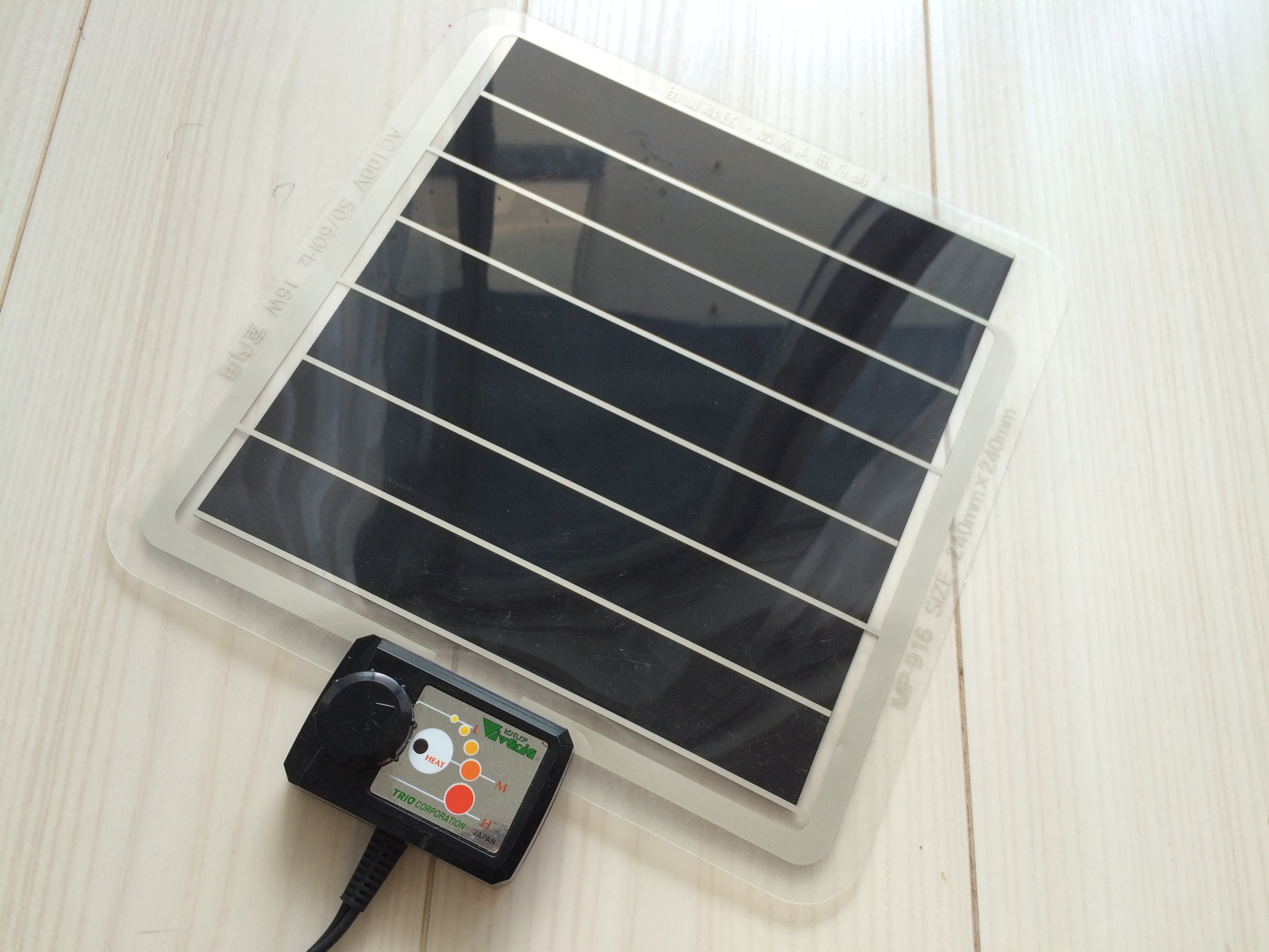 爬虫類を飼う際に使う用のヒーターです。ヒーターもいろんな種類があるのですが、植物用にも使えるように、平面のヒーターで温度調節機能がついてるやつにしました。Amazonで3000円くらいです。こいつを25℃前後(誤差が5℃もあるらしいですが。。。)に設定して、その上にゴーヤ発芽マシーンをセットしましょう。