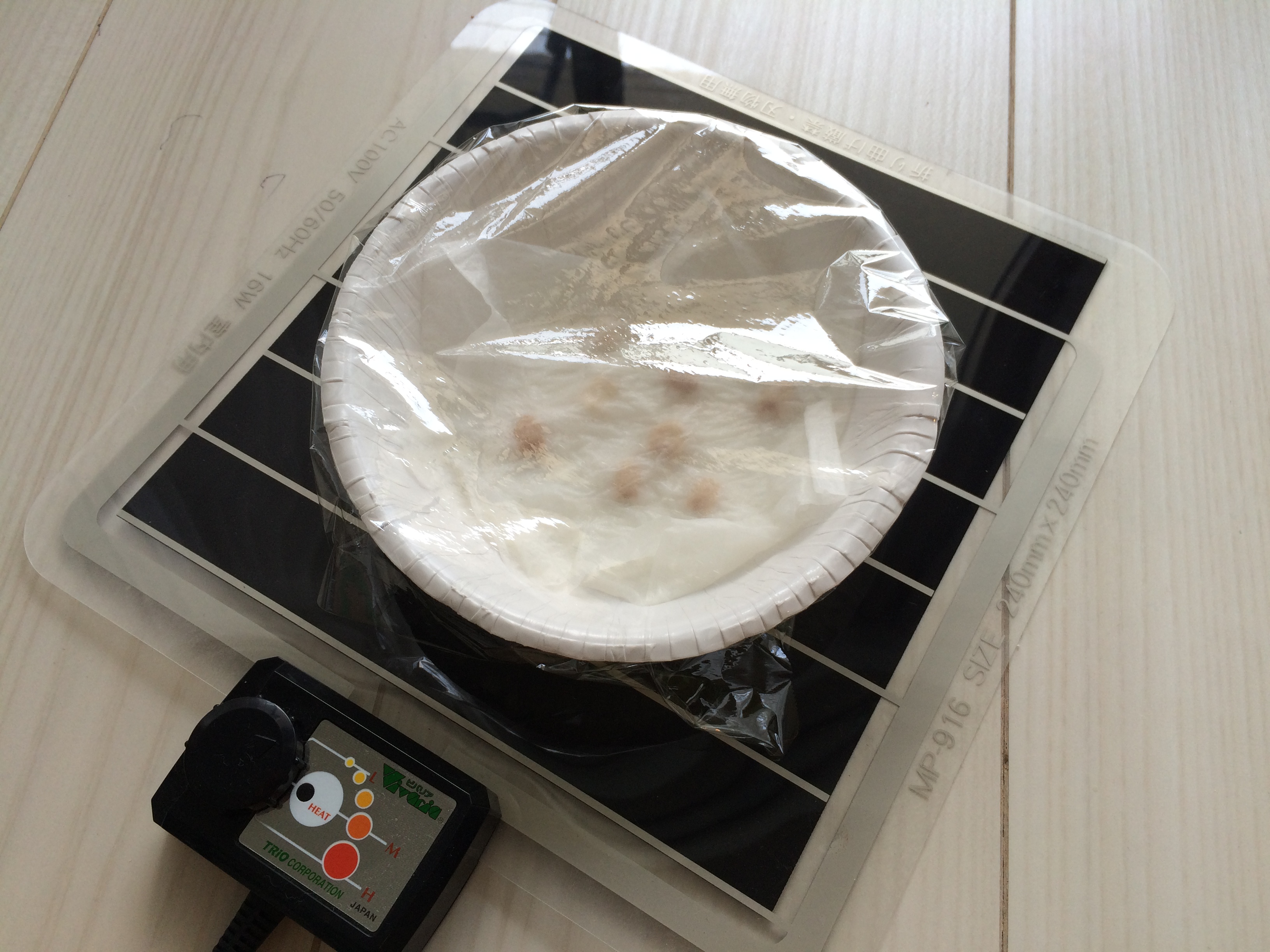 マシーンというか、ただの紙皿なんですけど。紙皿にティッシュを敷き、少し水で濡らして種を配置します。さらにその上からティッシュを重ねて、上から乾燥防止のサランラップをかければ完成です。