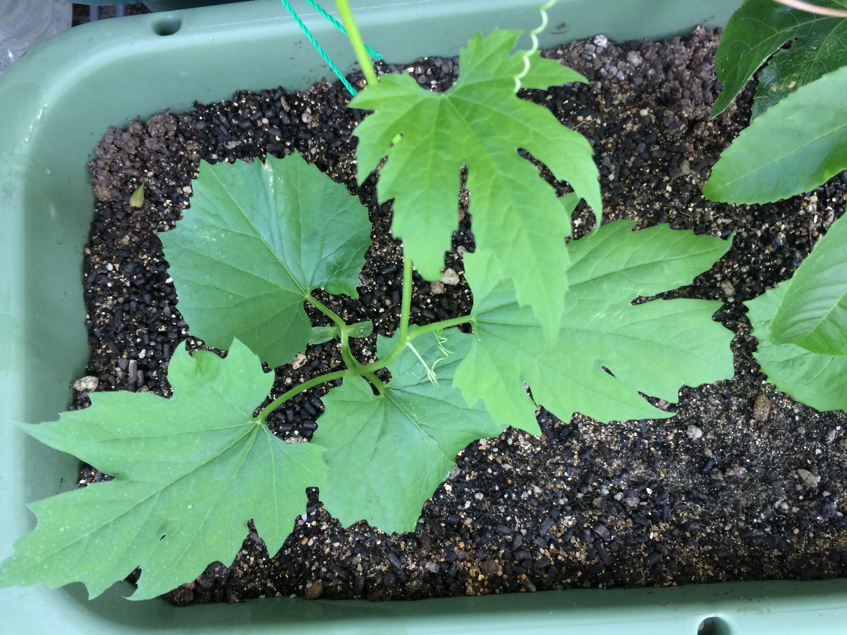 丸っこい葉が出た後に、ゴーヤらしいヒトデ型の葉っぱが生えてきます。これを本葉といいます。